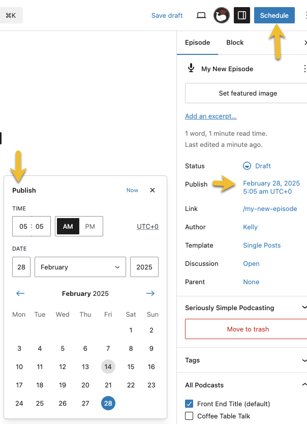 Scheduling a podcast episode in Seriously Simple Podcasting is just like scheduling a regular post in WordPress
