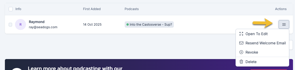 After subscribers have been added to your dashboard, open the menu for additional options including resending activation email or revoking access