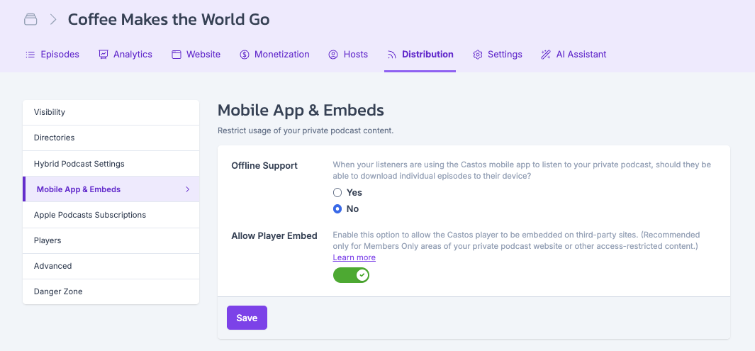 For Offline Support select Yes to allow your private subscribers to download episodes, select No to disable and prevent users from downloading episodes